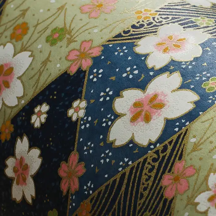 De Mihama theeblik is gemaakt van delicaat Japans washi papier, versierd met kersenbloesemmotieven – een symbool van vergankelijke schoonheid in Japan – gecombineerd met gouden rimpelingen op een middernachtblauwe en amandelgroene achtergrond. Toetsen van roze, ivoor en goud creëren een verfijnde, elegante harmonie.