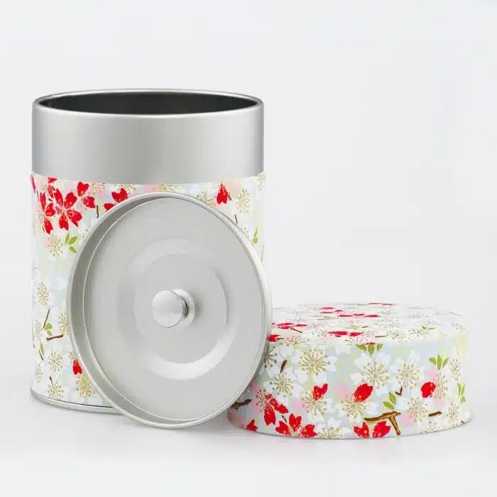 De Yanai theeblik is versierd met traditioneel Japans washi papier met delicate witte en roze kersenbloesems, met felrode accenten tegen een heldere pastelkleurige achtergrond. Dit lentemotief symboliseert de puurheid en vergankelijke schoonheid van de natuur en brengt tijdloze elegantie naar je proeflokaal.